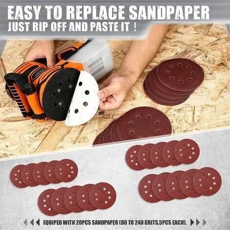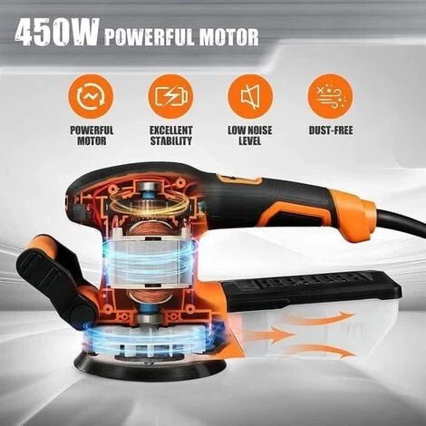 Cette ponceuse électrique offre un effet de travail efficace au moyen d’un moteur de 450 W qui génère 13 000 orbites par minute. 6 Le cadran de vitesse réglable vous aide à contrôler la bonne vitesse exacte en fonction des différents travaux. La conception intégrée du bloc d’équilibre en métal réduit considérablement les vibrations du fuselage lors du travail, et la poignée ergonomique en caoutchouc souple vous fait à peine sentir les vibrations. Le dépoussiérage haute performance vous offre un environnement de travail propre avec une taille compacte et une conception ergonomique. Les disques de ponçage de 5 pouces (5pcs x 80, 5pcs x 120, 5pcs x 180, 5pcs x 240 Grits) donnent à la ponceuse une longue durée de vie.