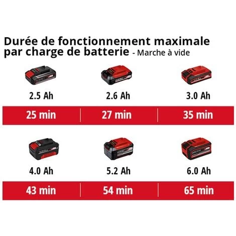L’appareil est vendu sans batterie ni chargeur. Ces accessoires sont disponibles séparément, notamment dans le starter-kit, très pratique. Pour une performance optimale, utiliser une batterie 2,5 Ah Einhell minimum.