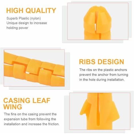 La description Avantage: bonne élasticité, bonne résistance à la traction, résistance aux chocs, pas de rupture, dureté élevée, pas de rouille, forte force d’expansion, peut éviter de glisser dans le trou du mur, produits beaux et pratiques, petite taille, grande charge, large éventail d’utilisations, installation rapide et facile, améliorer l’efficacité du travail et la qualité de l’installation Le kit comprend Jaune 6 ** 25 10PCS avec vis autotaraudeuses 6 * 30 10PCS avec des vis autotaraudeuses 6 * 40 10PCS avec des vis autotaraudeuses 8 * 40 10PCS avec des vis autotaraudeuses Bleu 6 * 25 10PCS avec des vis autotaraudeuses 8 * 38 10PCS avec vis autotaraudeuses gris 6 * 26 10PCS avec des vis autotaraudeuses 6 * 30 10PCS avec des vis autotaraudeuses blanc 8 * 60 10PCS avec des vis autotaraudeuses 8 * 80 10PCS avec des vis autotaraudeuses Instructions Percer le trou avec un foret efficace Nettoyer le trou Incorporer l’ancre à travers l’objet à réparer Visser les ancres Précautions Les ancrages en nylon nervuré (plastique) fonctionnent avec diverses vis à tôle de diamètre. Idéal pour l’ancrage dans le béton, la brique ou le panneau mural. L’ancre est résistante à la corrosion. Un trou pré-percé est requis.