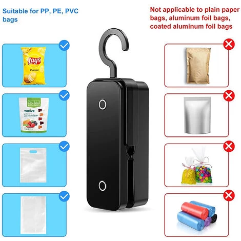 4. Convient a tous les types de sacs : la thermosoudeuse convient a tous les types de sacs, tels que les sacs alimentaires en PP, PE et PVC jusqu’a 0,3 mm d’epaisseur. Il referme les sacs de conservation des aliments, les sacs de croustilles, les sacs de fruits et les sacs de sucre en quelques secondes pour les rendre hermetiques.