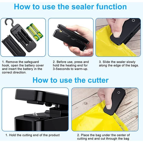 3. Facile a utiliser : une extremite pour sceller et l’autre pour couper. Avant d’utiliser le scellant, installez 2 piles AA, puis appuyez sur l’extremite chauffante pendant 3 a 5 secondes pour se rechauffer. Faites simplement glisser le scellant le long du sac pour le sceller instantanement.