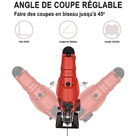 3 MODES DE COUPE ET BOUTON DE VERROUILLAGE : Cette scie sauteuse permet la coupe en ligne, l’inclinaison des coupes biseautées à 45º, la coupe en courbe ; La distance de va-et-vient est de 19 mm, peut couper rapidement; Permet de verrouiller la vitesse de travail grâce au bouton de verrouillage.